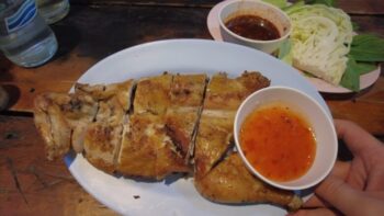 バンコクを訪れるたびに足を運んでしまう、私にとって非常に思い入れの深いイサーン料理店です。サナームキラーヘン(Surasak)駅からすぐの好立地にありながら、深夜4時まで営業しているという圧倒的な安心感があります。15年以上通い続けていますが、ここの看板メニュー「ガイヤーン(鶏の炭火焼き)」のクオリティは一切揺らぎません。炭火でじっくりと時間をかけて焼かれた鶏肉は、皮は驚くほどパリッと香ばしく、身を解けば肉汁が溢れ出すほどジューシー。添えられた特製のタレとの相性も抜群で、一口食べれば旅の疲れも吹き飛びます。賑やかな居酒屋のような雰囲気の中で、冷えたビールを片手に本場の風を感じられる最高の一軒です。